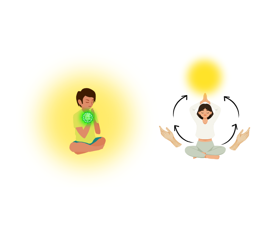 Nyní si otevřete Posvátný prostor. Spojte si dlaně před hrudí jako při modlitbě. Pomalu je zvedejte nad hlavu. Zkuste vnímat, jak prsty prostupují světelnou koulí osmé čakry Virakoči, která je nad vaší hlavou. Je to ona svatozář, která je znázorňována nad hlavou Ježíše, Buddhy a dalších mistrů. Vytočte dlaně do stran a velmi pomalu rozevírejte obvod světelné koule kolem svého těla, jako páv rozprostírá svůj ocas. Rozpřažené paže veďte podél těla až dolů. Zahalte se do jasu osmé čakry.