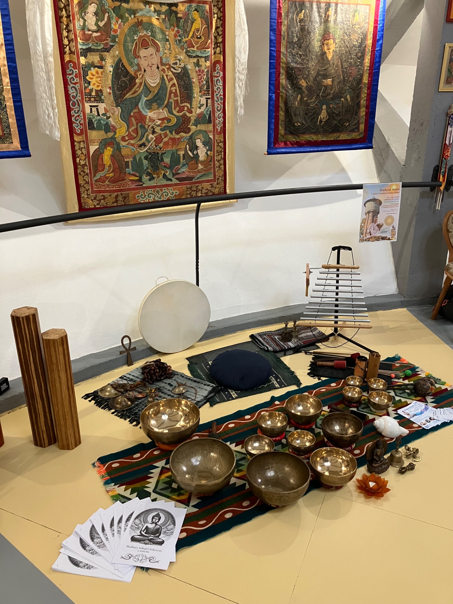 Skupinovou Zvukovou lázní vás provází intuitivně živě hrané zvuky tibetských mís, zvonků Koshi a Shanti, tibetských šengů, zvonků Dilbu, deštných sloupů a dalších harmonizačních nástrojů.